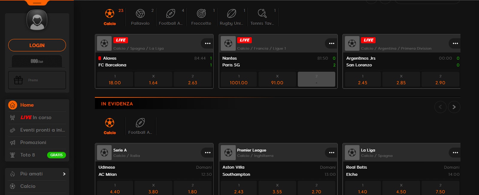 Una volta aperta l'app, avrete la possibilità di decidere se andare nella sezione sport, oppure nella sezione live per scommettere su eventi già iniziati. Inoltre potrete facilmente visualizzare gli eventi sportivi della giornata e ovviamente tutte le promozioni offerte dal bookmaker 888Sport.