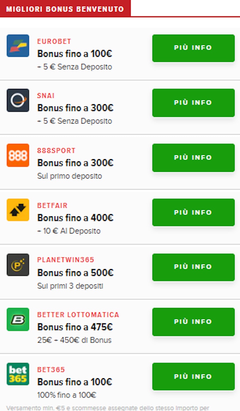 ![]() | 5x deposito + bonus | Quota min. 3.00 (almeno 1 selezione) | 5€ | 30 giorni |
