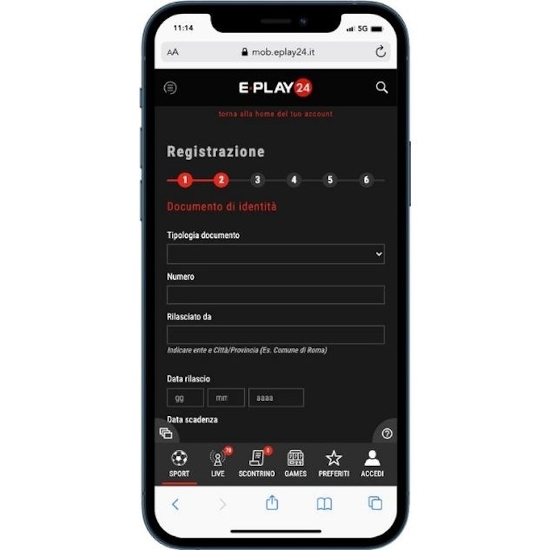 Come secondo step vi sarà chiesto di fornire i dati del vostro documento di identità. Qui potrete scegliere tra carta di identità, patente o passaporto: la cosa importante è che il documento scelto sia lo stesso che successivamente invierete all'assistenza clienti per convalidare il conto gioco.