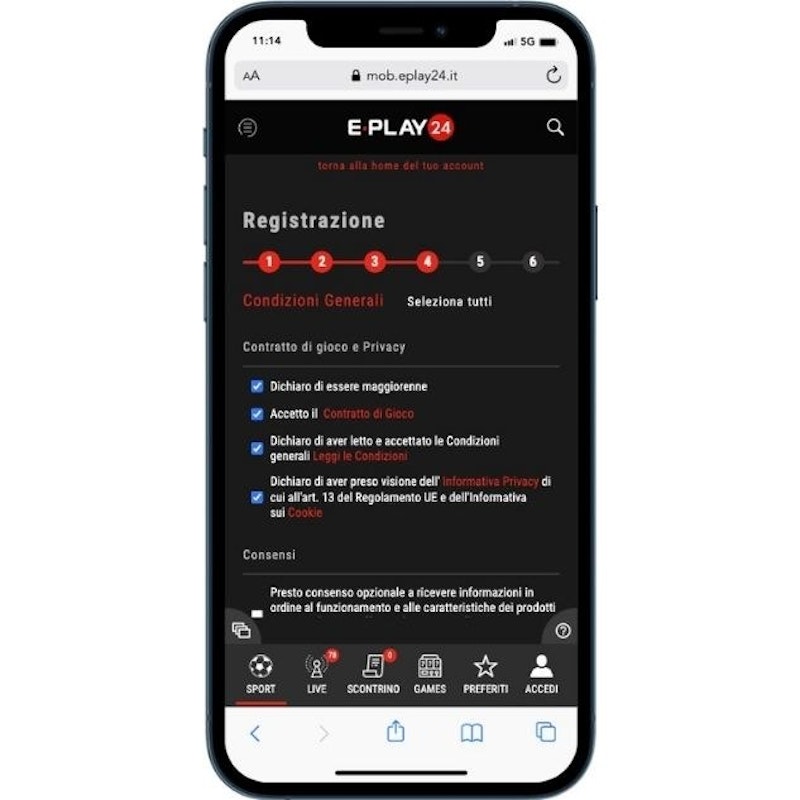 Una volta terminato di inserire tutti questi dati, dovrete confermare di essere maggiorenni, accettare il contratto di gioco e le condizioni, e infine acconsentire all'informativa sulla privacy.