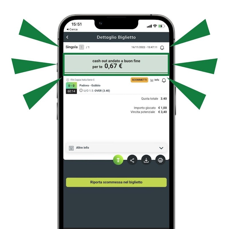 Ecco qui, il cash out è riuscito! I soldi saranno accreditati sul tuo conto immediatamente e la scommessa sarà chiusa.