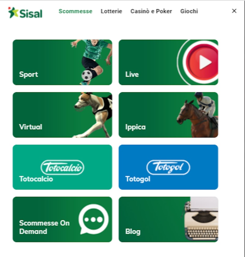 Accedendo a Sisal da mobile è possibile vedere il menù home Sisal da cui selezionare la sezione che interessa all'utente.
