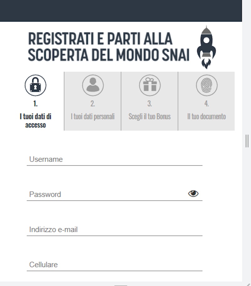 Ora verrai mandato alla pagina di registrazione Snai: per ottenere il bonus segui le indicazioni e registrati compilando i dati richiesti: la procedura di registrazione sul sito scommesse Snai è davvero breve e semplice.